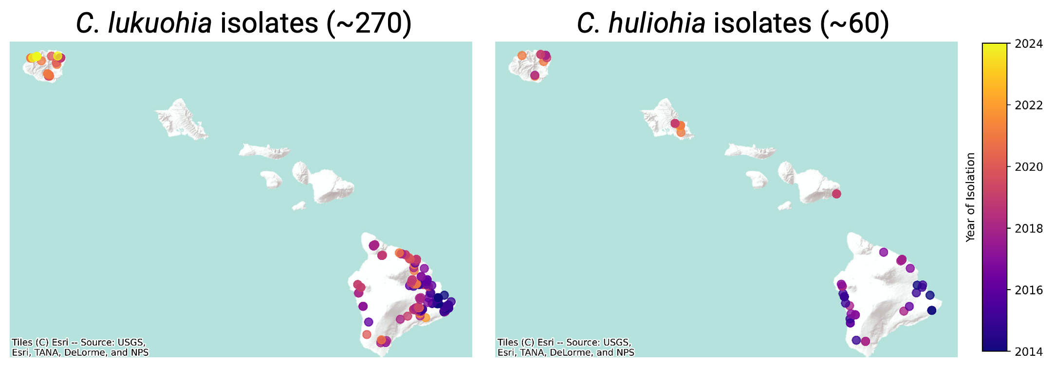 Hawai‘i’s native forests are threatened by Rapid ‘Ōhi‘a Death (ROD), a disease of the keystone and culturally significant native ‘ōhi‘a tree (Metrosideros polymorpha) species. ROD was first characterized in 2014, and is caused by two novel, non-native fungal pathogen species, Certaocystis lukuohia and huliohia. Previous work has shown that C. lukuohia causes more aggressive disease, and likely originated from a single introduction to Hawai‘i Island within the past few decades. Meanwhile, C. huliohia is less aggressive, contains greater genetic diversity, and may have been introduced much earlier. Given these differences, there is currently much discussion regarding the respective management strategies of the two ROD pathogens. However, the evolutionary histories and invasion dynamics of both pathogens are not well understood, and their genomes remain largely uncharacterized.